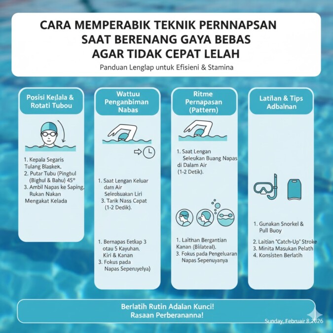 Memperbaiki teknik pernapasan saat berenang gaya bebas bukan hanya soal menarik napas lebih dalam, tetapi melibatkan posisi kepala, ritme bernapas, hembusan udara di bawah air, rotasi tubuh, dan latihan konsisten. Dengan menerapkan langkah-langkah ini, stamina renang meningkat, kelelahan berkurang, dan pengalaman berenang menjadi lebih menyenangkan.